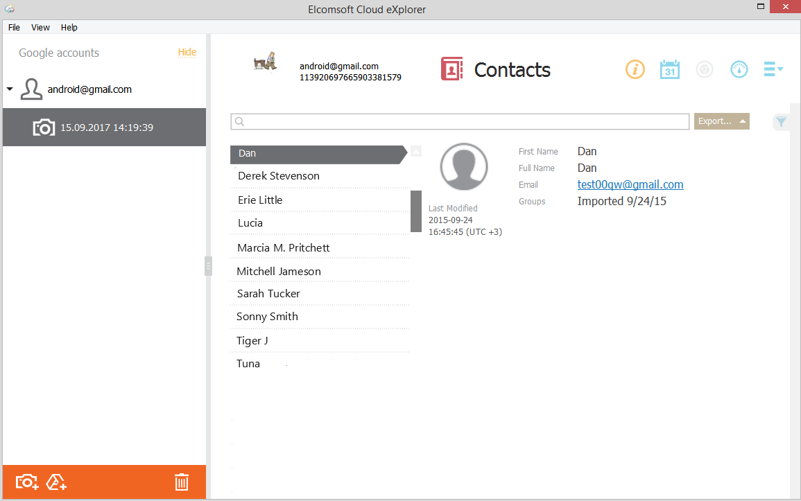 With ECX, you can view the Google account user's contacts. In the left pane of the main window, you can see the list of contacts sorted by their name in the alphabetical order. The contacts with no name specified are displayed at the end of the list with the No Name tag. The contacts which belong to the Favorite group are marked with a star.