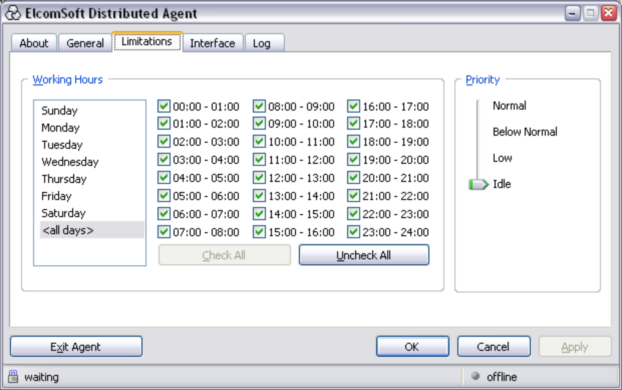 The tab under the name of «Limitations» allows you to install local administration in the bookmark of «General», to set working hours during which the program will be able to perform computations by weekdays, and the system priority which will be used for that. If you set remote administration , you will be able to look through the working hours and priority preset on the server (Figure 5.1).
