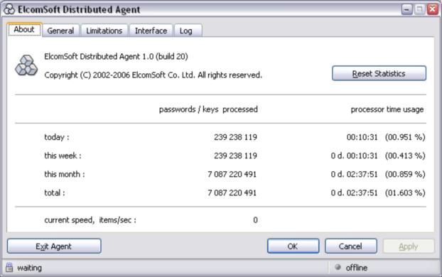 In the «About» tab the passwords, keys and processor time usage are registered. The statistics is maintained for the current day, week, month and for the whole time after the last reset. (Figure 4.5).